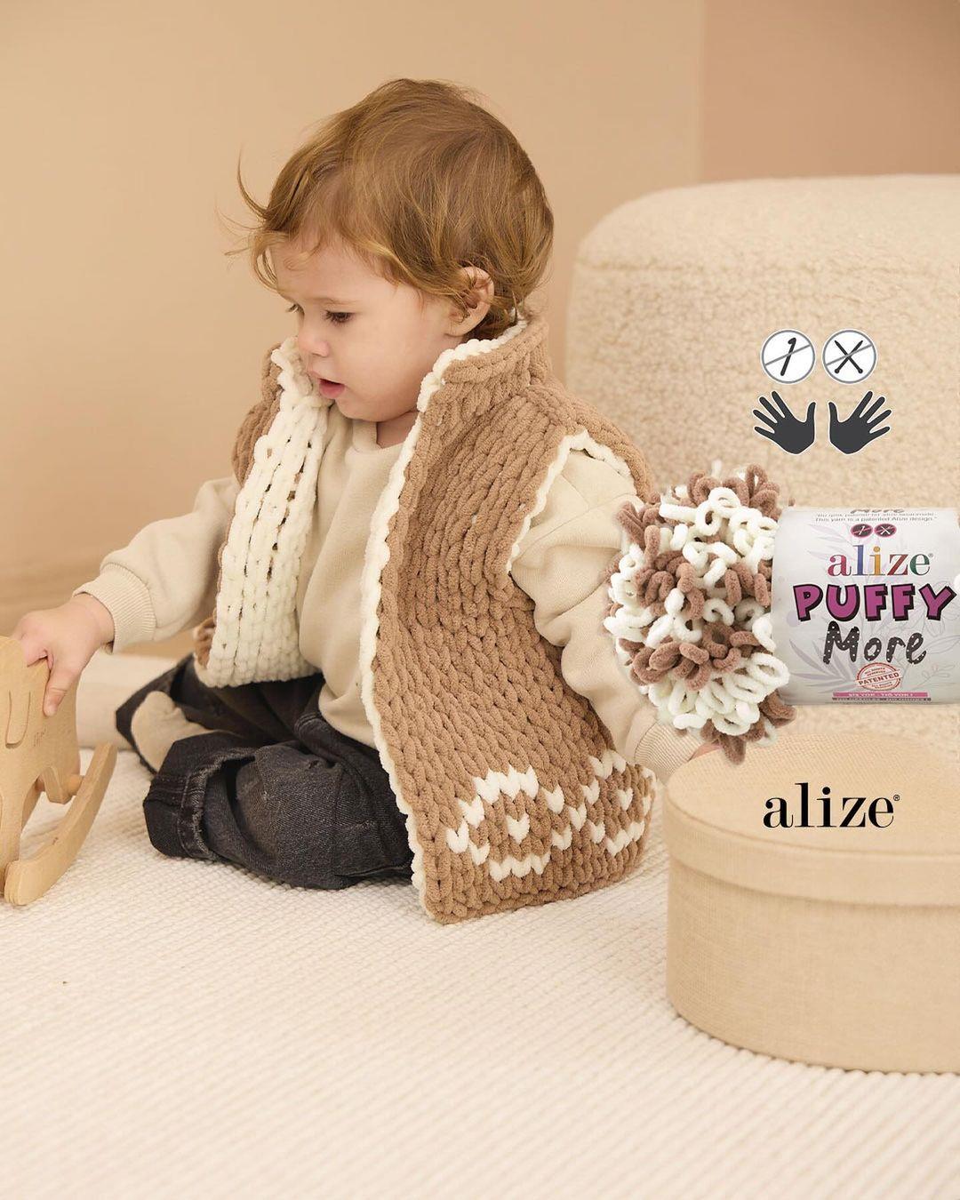 Puffy More is the latest yarn from the Alize Puffy family. This puffy version not only offers patented knitting without needle (finger knitting yarn), but also a unique and refined knitting experience with which you get reversible images with reverse colours on the back. You can create magical patterns, mosaics or pixel patterns with this yarn. Knitting with your fingers is super easy.
